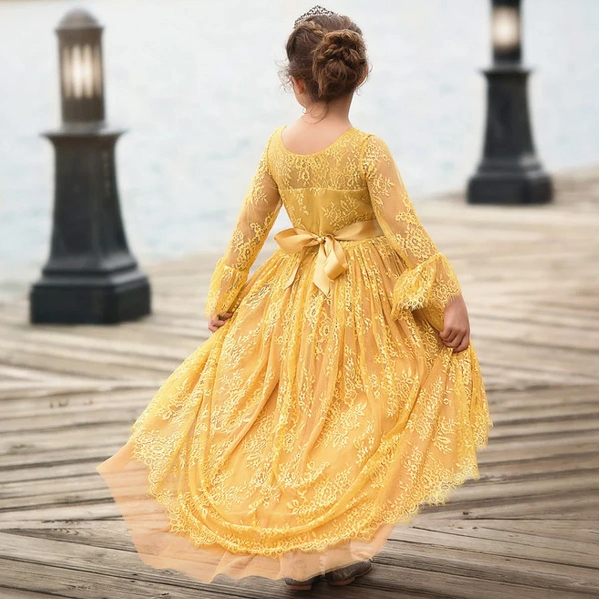 THIS ITEM RUNS ONE SIZE SMALL, WE ADVISE ORDERING UP. This vintage inspired lace gown is absolutely stunning! With french eyelash edging, this soft lace gown features a hi lo skirt and a removable sparkle belt. 3/4 length sleeves are finished off with a sweet ruffle and eyelash trim edging. This lace is extremely soft, never itchy and fully lined with soft cotton. Side zip. 100% poly self, 100% soft cotton lining. Machine wash, hang dry.