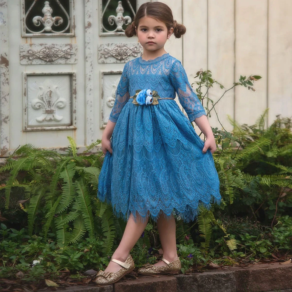 This vintage inspired lace frock is absolutely stunning in person. The color is a dreamy cornflower blue and photographs amazing. The lace is soft, not scratchy and has a French eyelash edging, creating a perfect touch of vintage whimsy. The dress is fully lined with soft cotton and has a back zipper. The braided flower belt is completely removable and self ties in back for just the right amount of glam. This color looks amazing on all hair colors and is a photographers dream to shoot. Machine wash, hang dry.
