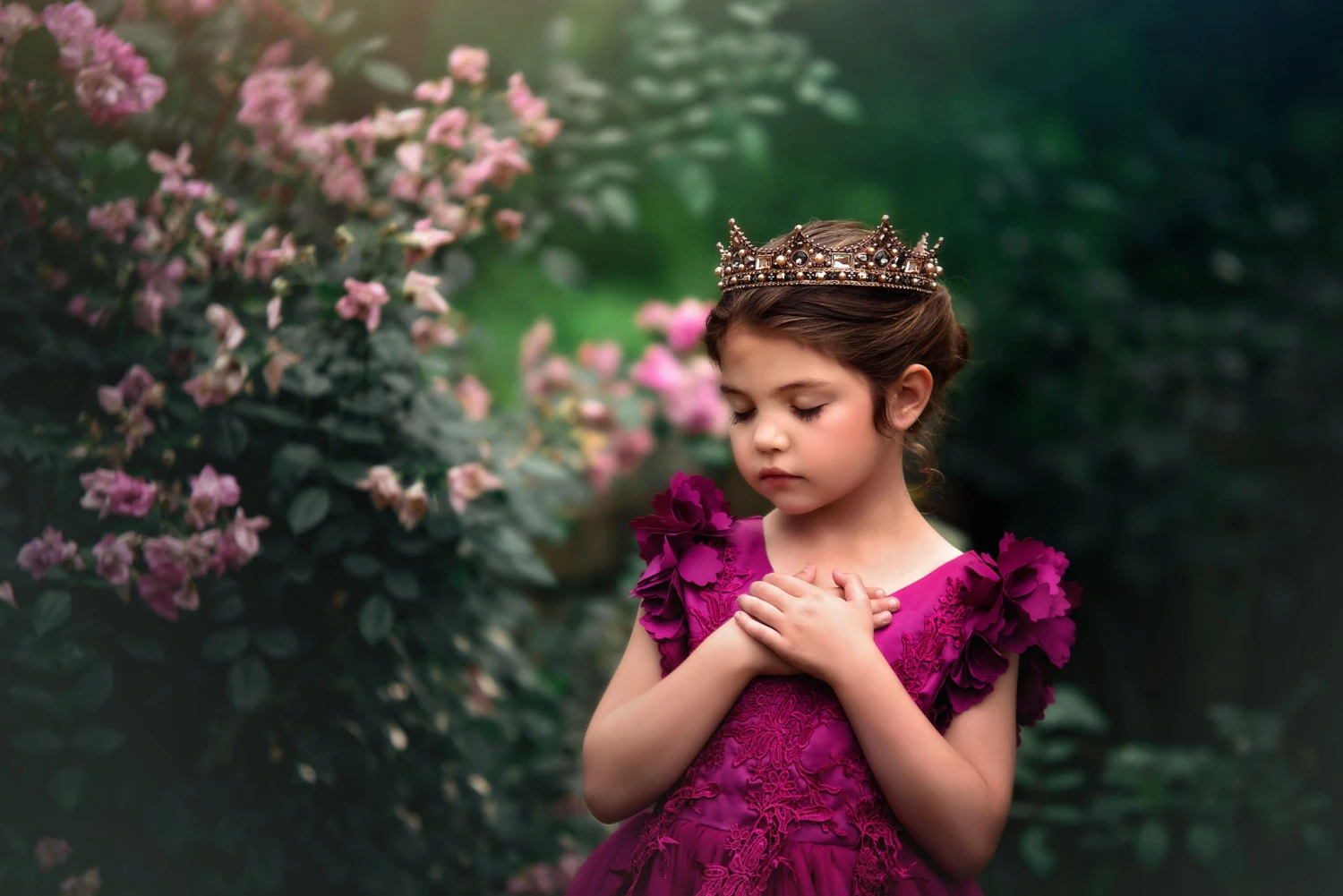 Fit for a princess, this dress has it all. Soft berry satin graced with a touch of lace, this dress is a showstopper! Sleeves are embellished with whimsical die cut flowers that will have all eyes on her. Tuling overlay skirt adds just the right touch of fullness and twirl. Fully lined with soft cotton, back zip. 100% poly self, 100% cotton lining. Machine wash, hang dry.