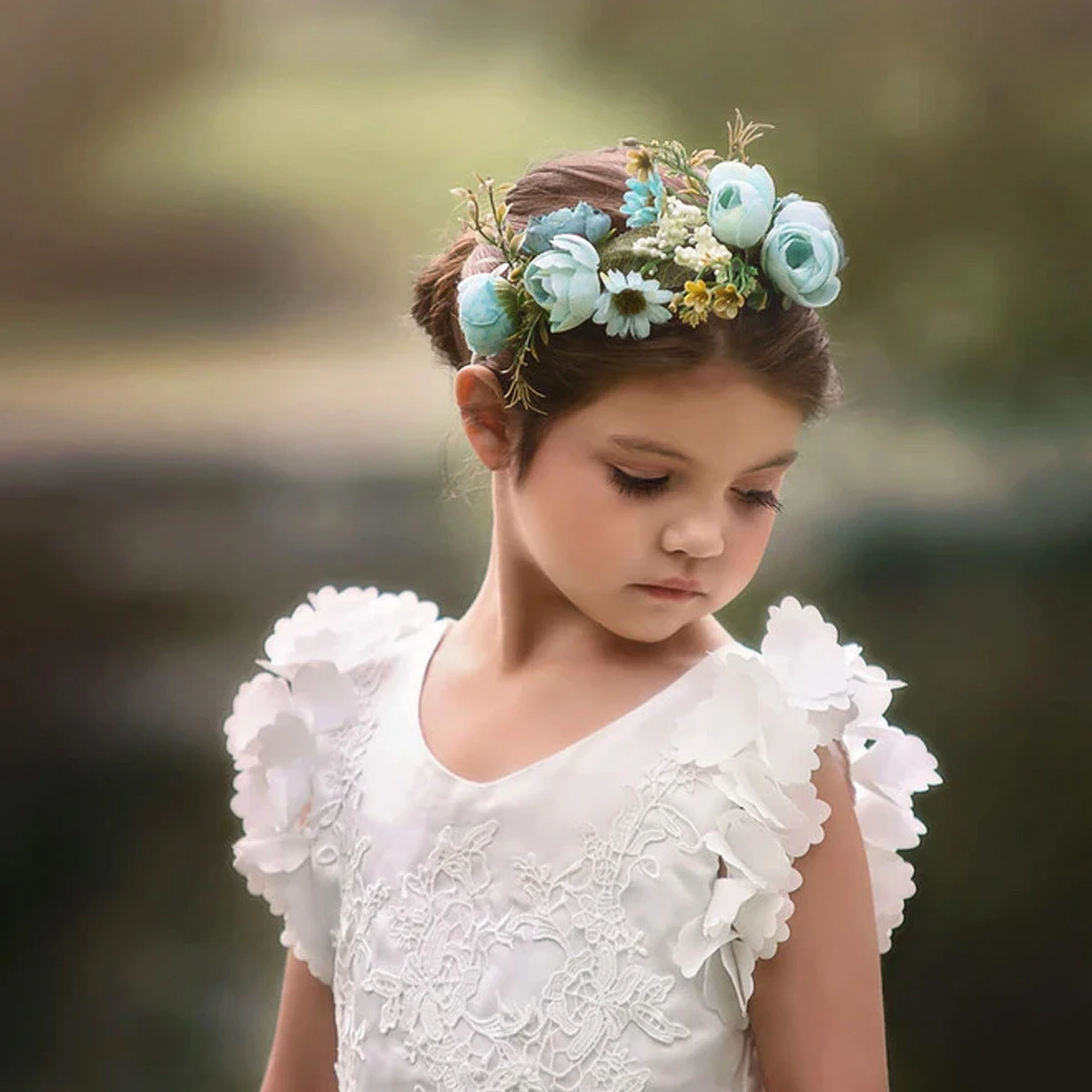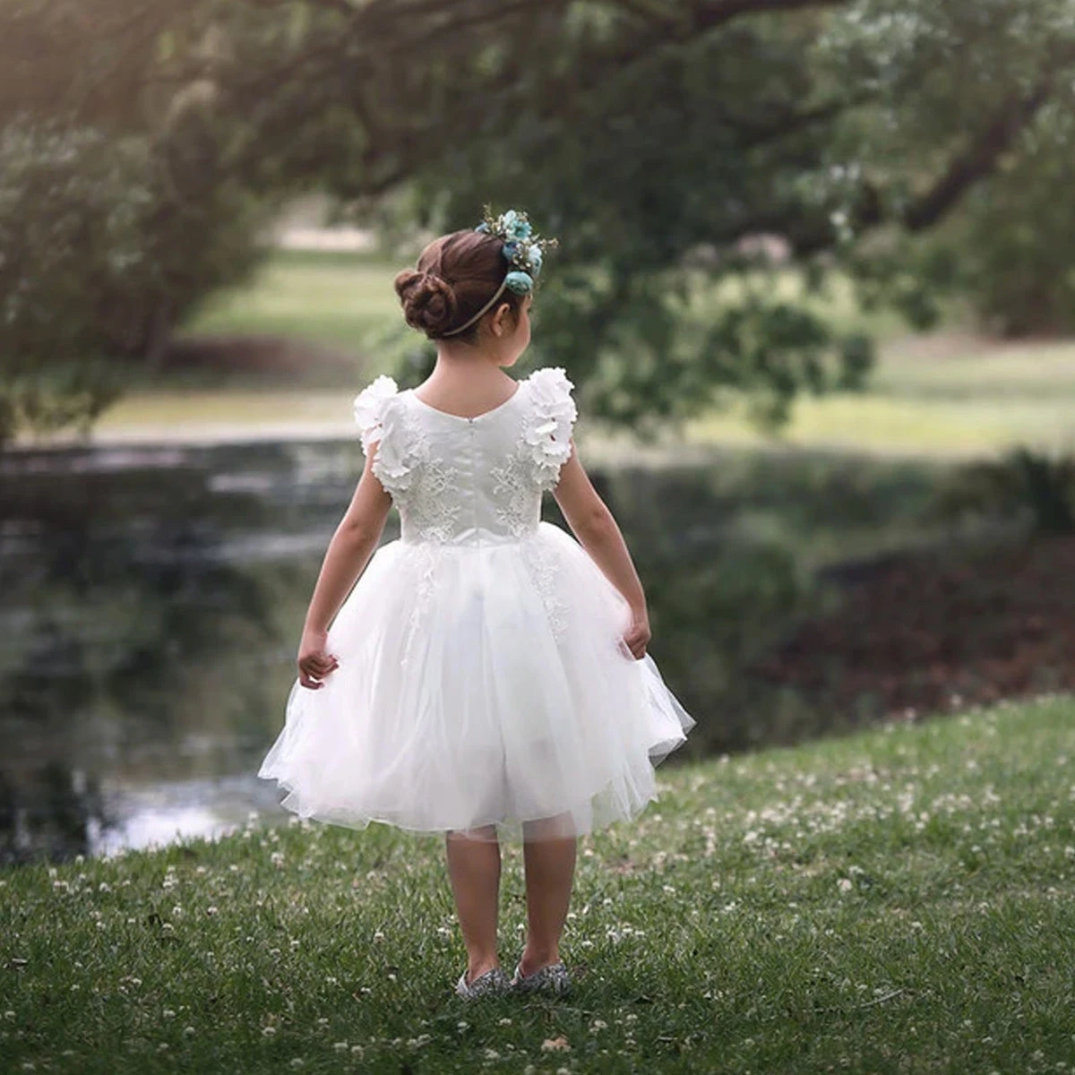 Fit for a princess, this dress has it all. Soft white satin graced with a touch of lace, this dress is a showstopper! Sleeves are embellished with whimsical die cut flowers that will have all eyes on her. Tulling overlay skirt adds just the right touch of fullness and twirl. Fully lined with soft cotton, back zip. 100% poly self, 100% cotton lining. Machine wash, hang dry.