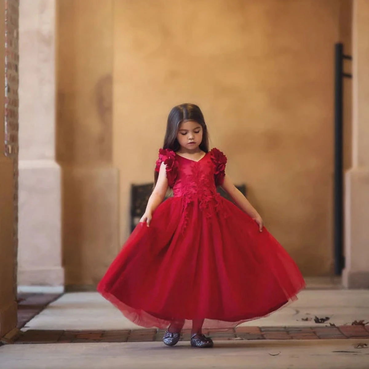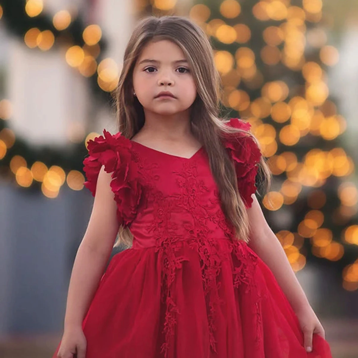 Fit for a princess, this dress has it all. Regal crimson satin graced with a touch of lace, this dress is a showstopper! Sleeves are embellished with whimsical die cut flowers that will have all eyes on her. Tulling overlay skirt adds just the right touch of fullness and twirl. This is a gorgeous full length gown and incredible value for a gown of this caliber. Fully lined with soft cotton, back zip. 100% poly self, 100% cotton lining. Machine wash, hang dry.