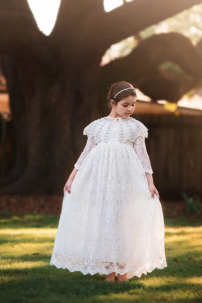 This jeweled cape is a gorgeous addition to her gown! Pearls and rhinestones embellish a beautifully embroidered scalloped edge cape. This is a substantial piece, you won’t believe you paid so little for such luxury! Fits sizes 3-10. Mode is size 10 in our photograph.