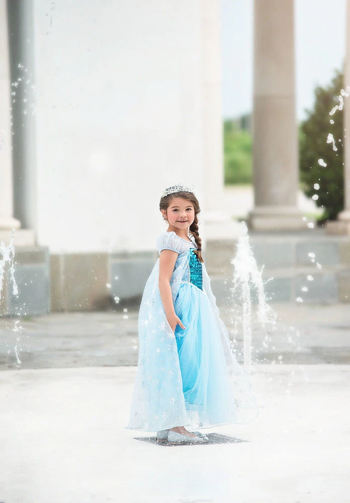 One of our most adorable Ice Queen costumes, this dress will not disappoint with all it’s cuteness! The sheer embellished cape is attached to layers of tuling and a sparkly sequin bodice. Finished off with puff sleeves and sweet trim, this dress is a real gown and not a cheap plastic costume. We are never itchy and never use glitter! A tremendous value for such cuteness. 100% poly self, fully lined and back button. Hand wash, hang dry. DO NOT WASH IN MACHINE, OR SNOWFLAKES WILL COME OFF. DON’T FORGET HER MATCHING DOLL DRESS!