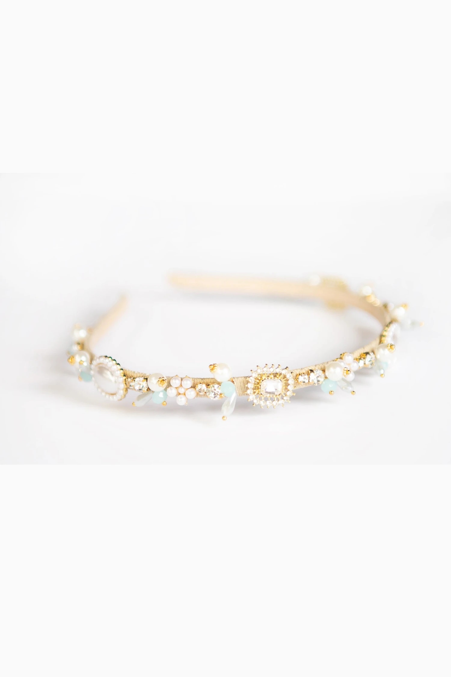This headband is one of our favorites! So much detail and sparkle! The faux pearl and diamond stones are sprinkled with just a touch of light blue for the sweetest touch to her favorite outfit!