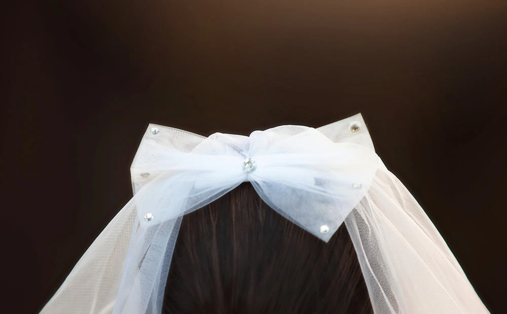 This gorgeous bow top veil has just a hint of sparkle with all the right sweetness. Two layers of ruffled edge tulling finish off the look with a hair comb for easy attachment.