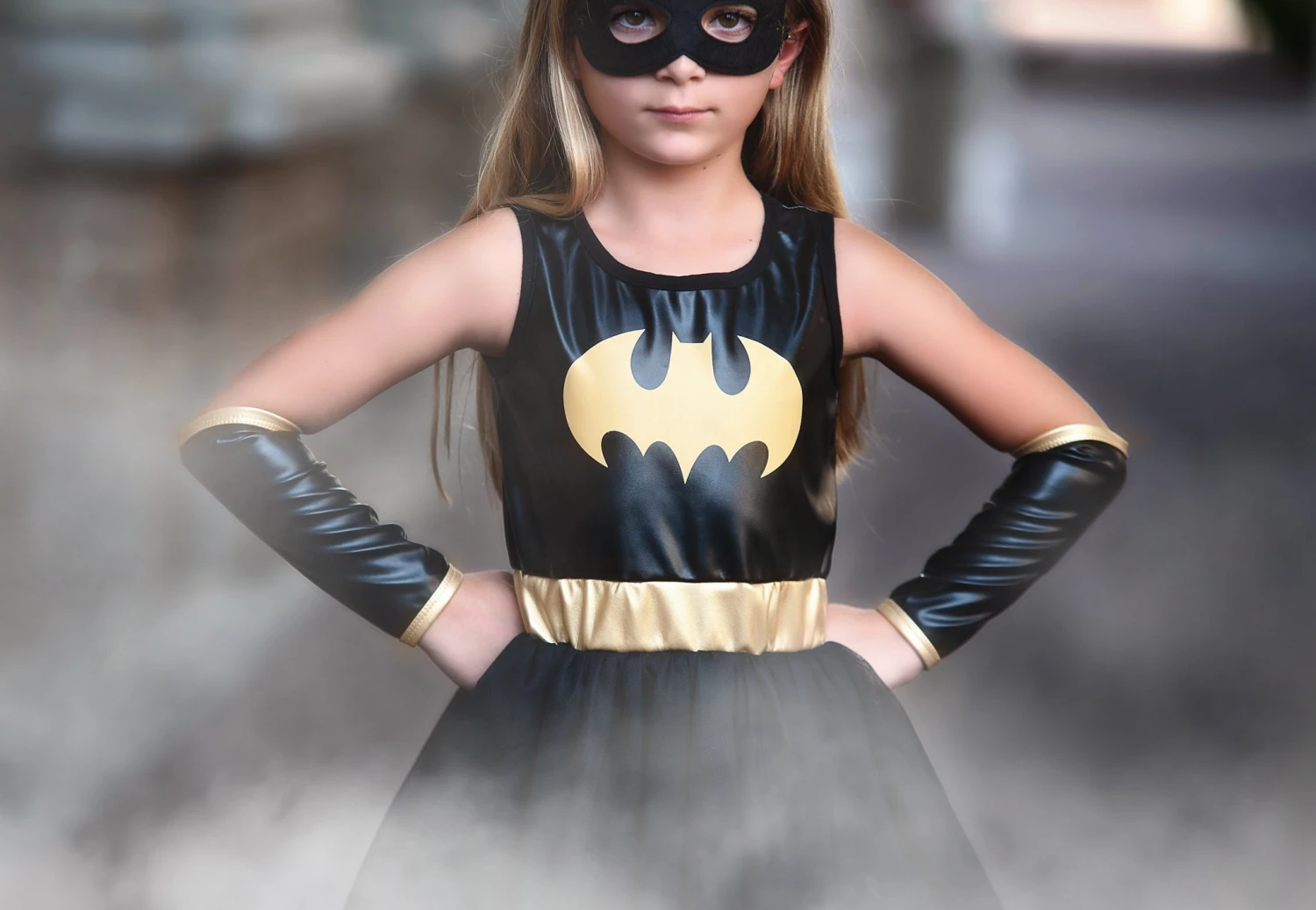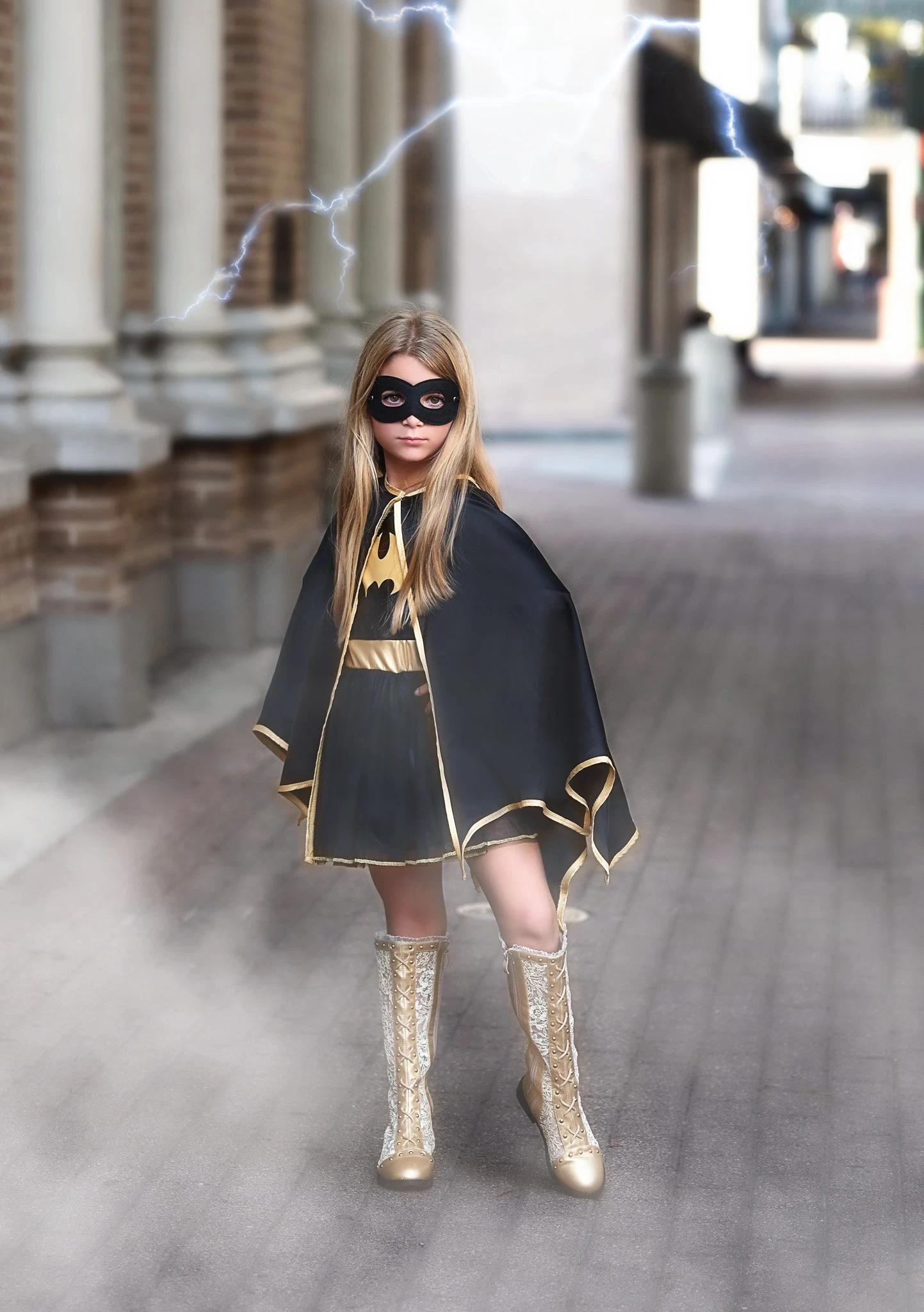 The Bat Queen has arrived and she’s oh-so-sassy. This darling 4-piece set features a dress, cape, glovettes and mask.