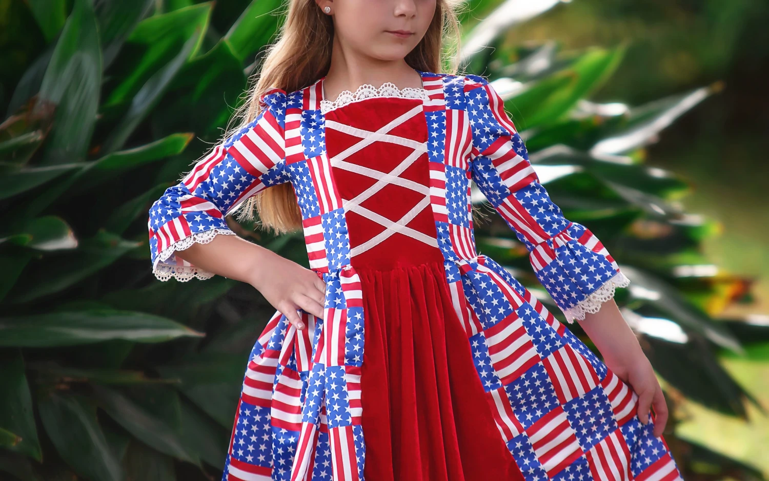 Meet the Historical Heroine! This darling dress features soft cotton velvet graced with a patriotic flag pattern and finished off with sweet lace trimmings. Bell sleeves add the extra touch of glam for her look.
